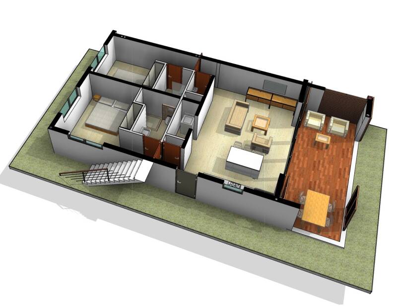 - Indeling: Woon/Eetkamer met aansluitend keuken, 1 master slp kamer en 1 gasten slp kamer. 1,5 badkamer, een berging en 1 gasten toilet. Volledig openslaande schuifpui als entree naar het terras en pool met buitendouche.