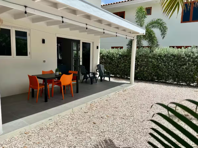 Het is natuurlijk heerlijk om op Curaçao buiten te zitten in een verkoelende bries. Dat kan op het overdekte terras zowel aan de 4 persoons eettafel als op de loungeset.